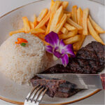Stir-fried beef tenderloin, seafood mix, soy sauce, garlic, onions, tomato wedges, cilantro, red wine, fries, rice.